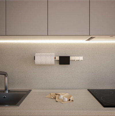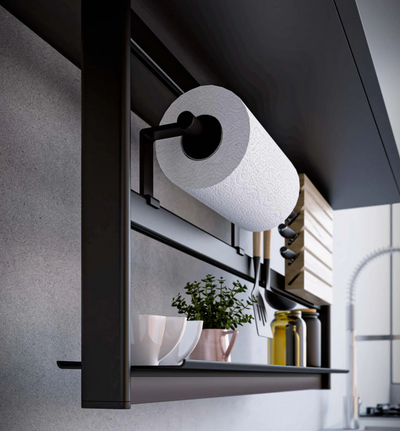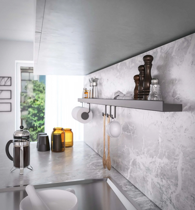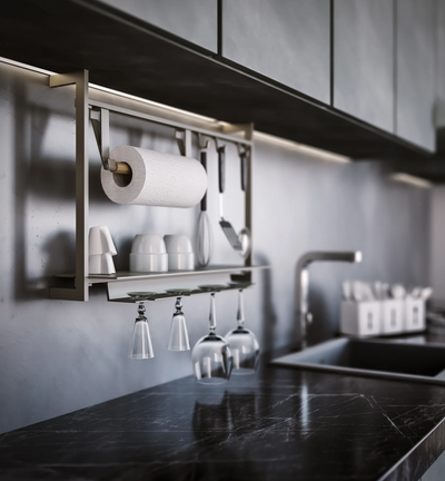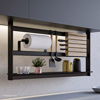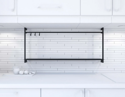 Ezt az egyedi polcrendszert a munkapult feletti tér hasznosítására tervezték, a felsőszekrény aljához rögzítve - ezáltal hátfali rögzítés nem szükséges a felszereléséhez. Biztonsági okok miatt azonban arra ügyelnünk kell, hogy a szekrény alja, amelyre szereljük, megegyező szélességű legyen a polcrendszerével.